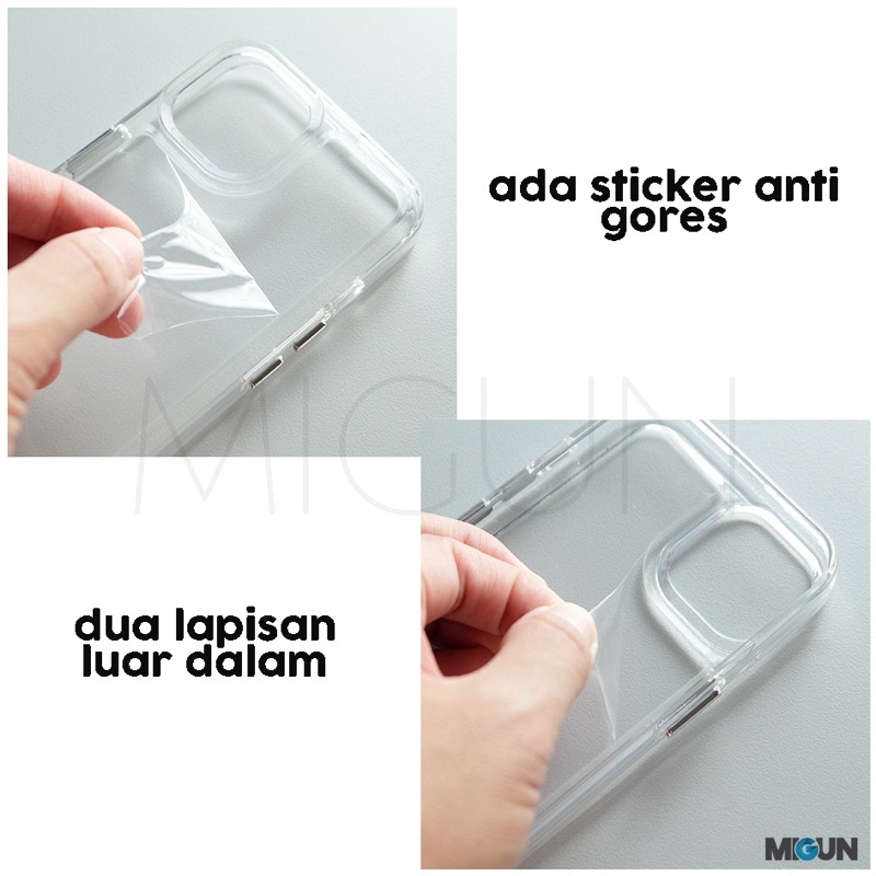Case ini terbuat dari kombinasi softcase yang fleksibel di bagian samping dan akrilik yang kuat di bagian belakang. Ini memberikan perlindungan maksimal tanpa menambah bobot yang berlebihan, sehingga Anda tetap nyaman saat menggunakan ponsel.