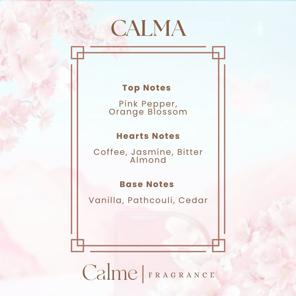 Dengan aroma kopi hitam yang intens, bunga jasmin yang elegan, dan sentuhan manis dari vanila, Calme CALMA menciptakan pengalaman beraroma yang menawan dan penuh karakter.