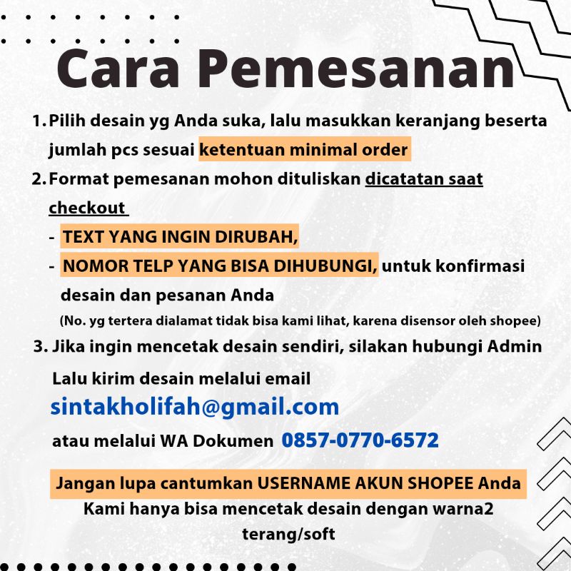 - Minimal Order: Terdapat ketentuan minimal order untuk setiap produk, silakan cek di foto produk slide kedua.