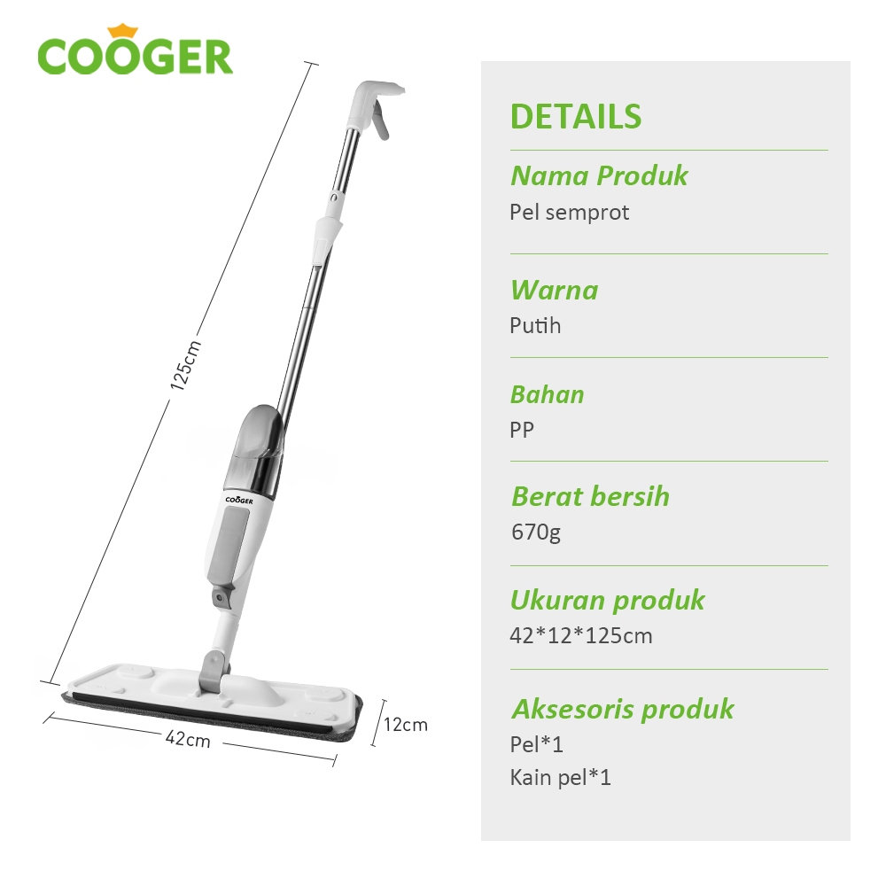 COOGER Alat Pel Lantai New White Spray Mop Automatic Water Tank adalah pilihan terbaik bagi Anda yang menginginkan kebersihan rumah dengan cara yang praktis dan efisien. Dengan desain yang elegan, fungsionalitas yang tinggi, dan kemudahan penggunaan, alat pel ini menjadi teman ideal dalam menjaga kebersihan lantai Anda. Jangan lewatkan kesempatan untuk memiliki alat pel yang dapat mengubah cara Anda membersihkan rumah. Segera pesan sekarang juga!