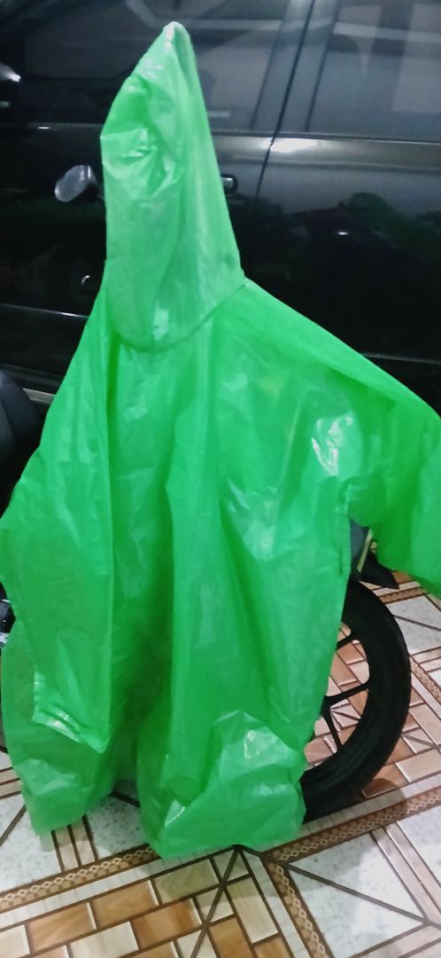 Ketahanan:untuk kondisi hujan Cocok untuk:semua Ketebalan:tebal jas hujan bahan plastik.hijau ponco panjang dibawah lutut sedikit.ukuran oversize.tudung kepala ada tali.merah setelan oversize muat buat saya.harga murah.packing double plastik.pengiriman standar.