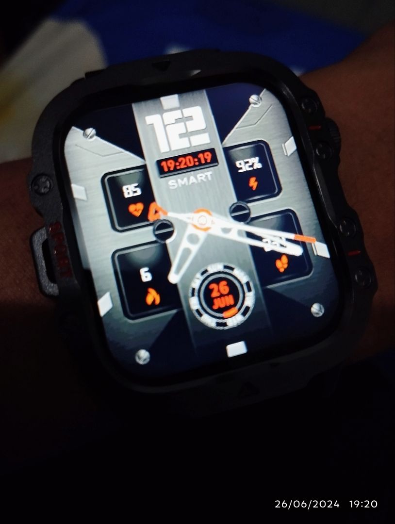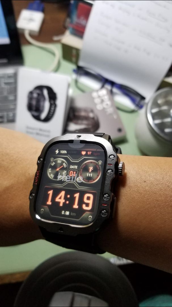 Fitur:bagus Fungsi:berfungsi baik Penerangan:cukup Smartwatch keren, sporty, fitur komplit, pas dengan kantong, model laki banget, keren & mantap. Tks kak