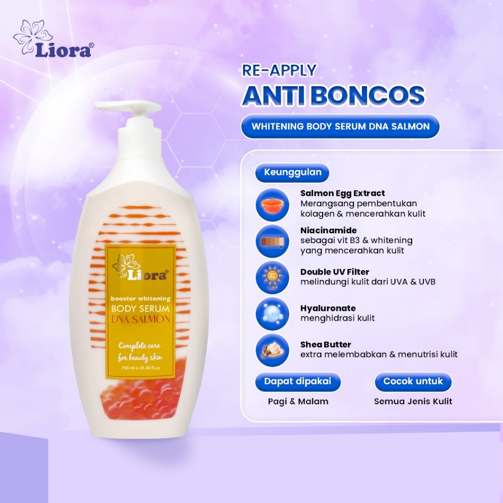 Jangan lewatkan kesempatan untuk memiliki kulit yang cerah dan sehat dengan Liora Booster Whitening Body Serum DNA Salmon. Dengan kemasan 750 ML yang praktis dan terjamin keamanannya, Anda akan mendapatkan perawatan kulit yang efektif dan menyenangkan.
