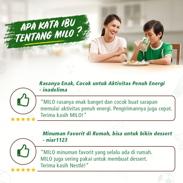 "Setelah memberikan MILO kepada anak saya, dia lebih berenergi dan semangat untuk beraktivitas. Rasa cokelatnya juga sangat disukai!" - Ibu Rina