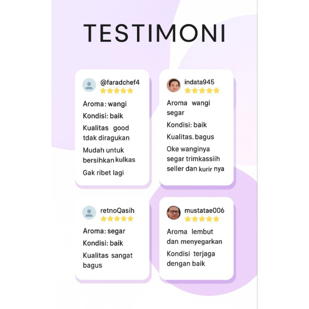 Aroma:memiliki wangi yang menyenangkan Kondisi:dalam kondisi yang baik Kesegaran:terasa sangat segar Paket dah sampai wangi bangat segar Murah lagi bisa membersihkan segala macam kompor kulkas cosmos pokonya besta bangat maksih kurir kalau dah habis pokoknya mau pesan lagi