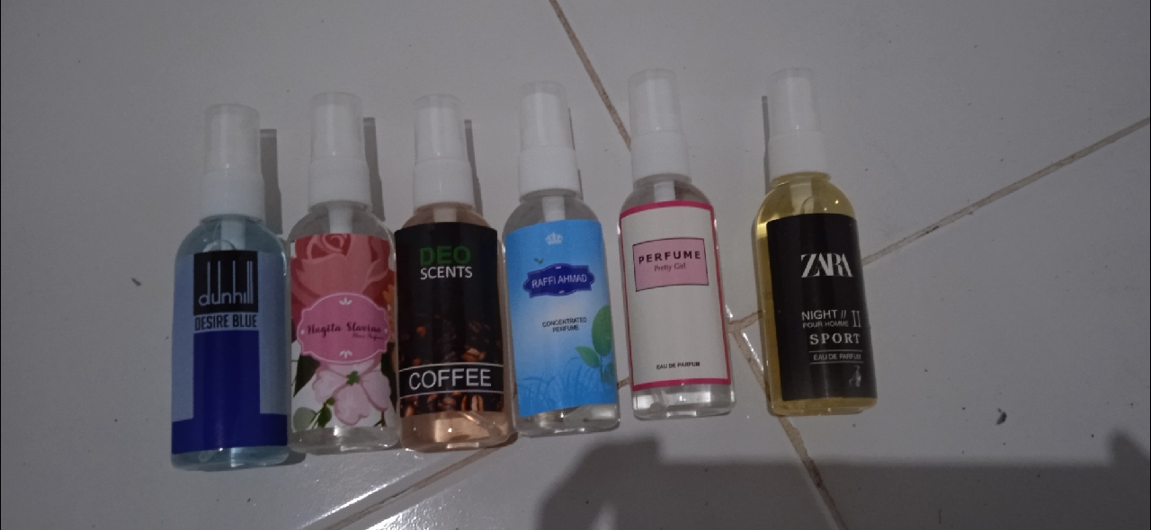 Alhamdulillah paketnya sudah sampai dengan selamat. Packaging aman sebab pakai bubble wrap. Untuk kualitas parfumnya lumayan lah yaa dg harga yg super murah. Yg Angel heart wanginya strong, harus dipakai sedikit² aja. Yg peach baby soft dan sweet banget wanginya, Aroma yg Coffee enak banget, cukup kuat kopinya, bikin tenang, yg Dunhill fresh wanginya. Semua suka. Thanks seller