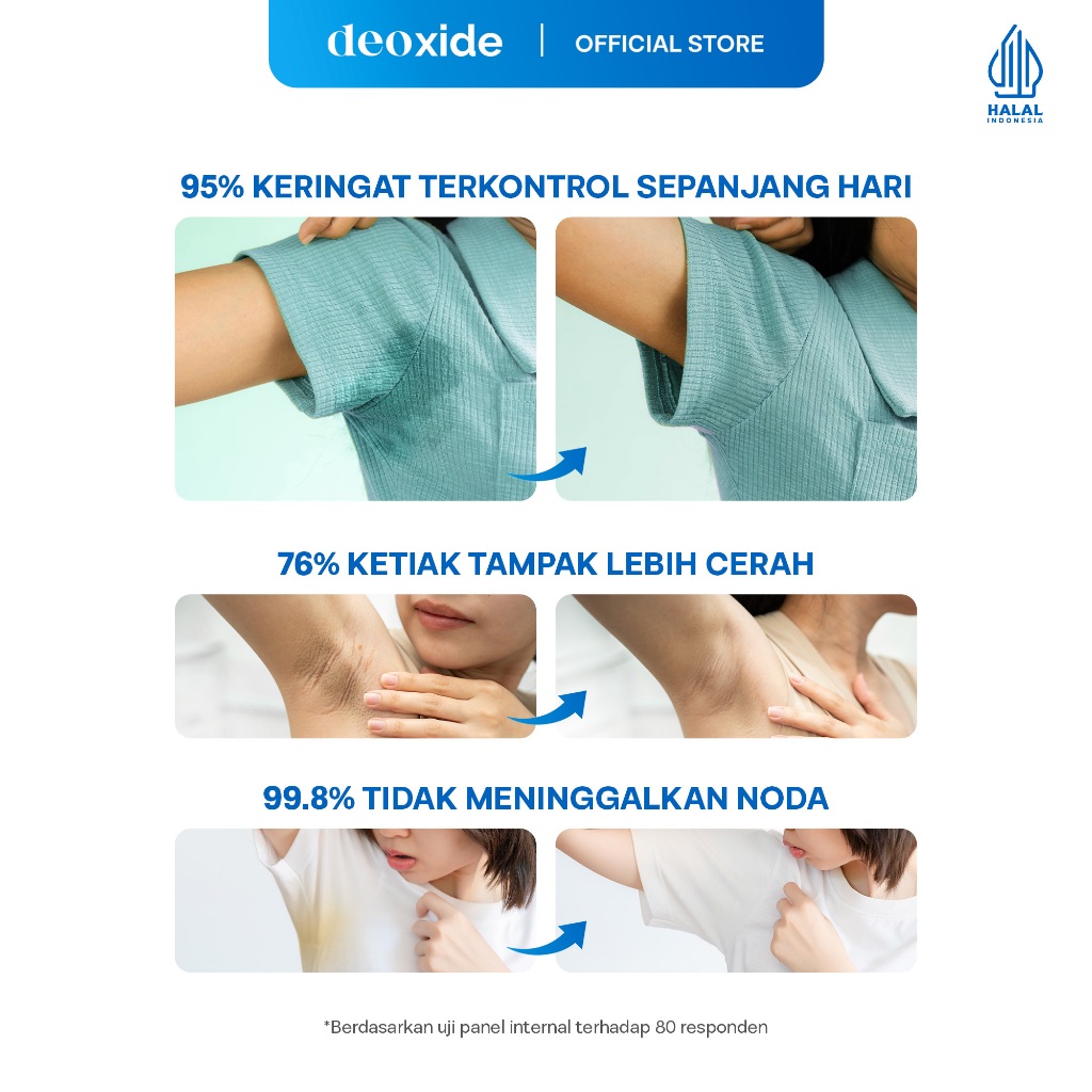 Salah satu keunggulan dari Deoxide adalah produk ini cocok untuk semua jenis kulit, termasuk yang rentan berkeringat berlebih. Dengan formulasi yang lembut dan efektif, Anda tidak perlu khawatir akan iritasi atau efek samping yang tidak diinginkan.