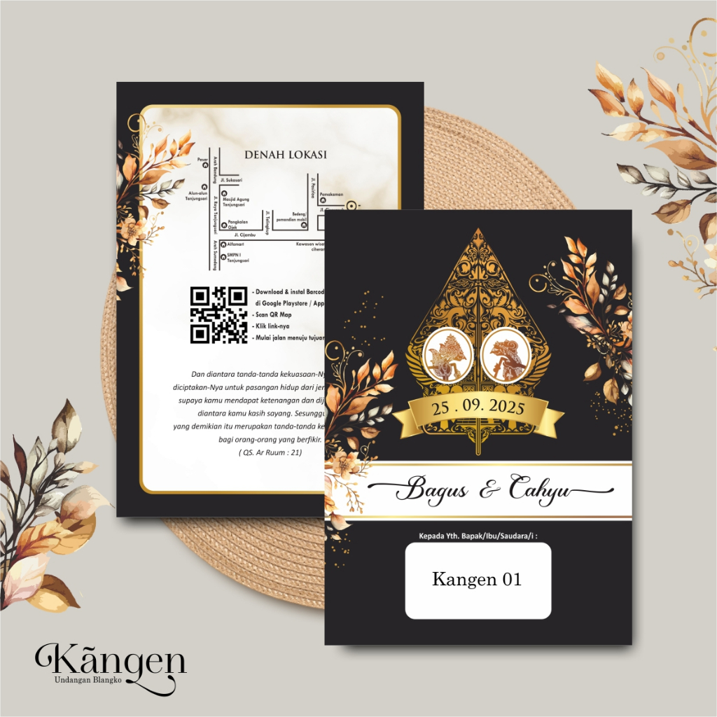 - Ukuran undangan bervariasi, termasuk Kasih, Sayang, Kangen 01 (±13,5 x 18 cm), Kangen 02 (±18,5 x 12,5 cm), dan Kangen 03 (±13 x 18 cm).