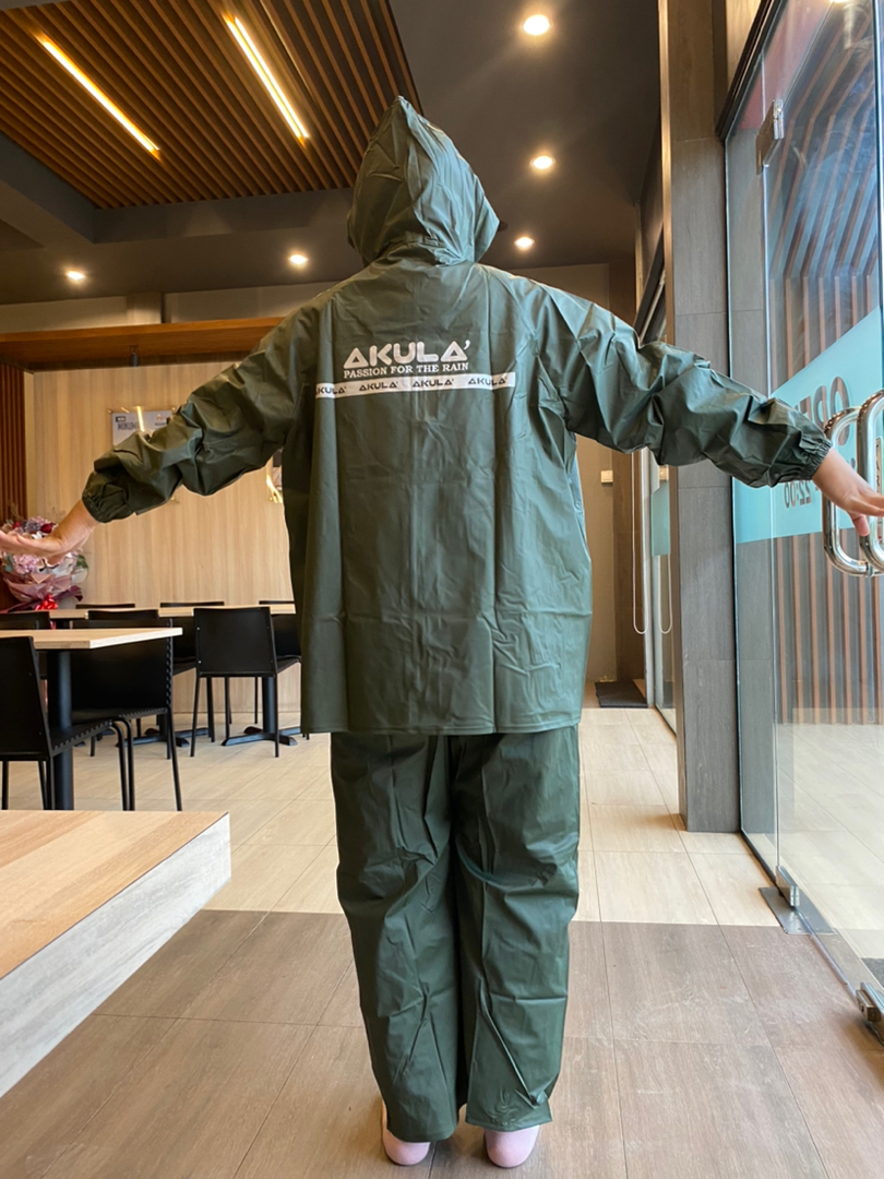Performa:passion for the Rain Kualitas:bagus Cocok Untuk:dipakai saat hujan. Mantap, dari slogannya aja udah paham dah "AKULA : PASSION FOR THE RAIN" 😁👍🏻 Warnanya unik (krem), bahannya tebal, sedikit elastis, jahitannya rapi. Tapi karan badan ku besar, agak sempit kalau pakai pakaian kerja. Itu di foto cuma pakai kolor aja wkwkwkwkw Pengiran cepat pula, tgl 7 malamnya pesan, tgl 9 siangnya sampai dah. Thanks Akula