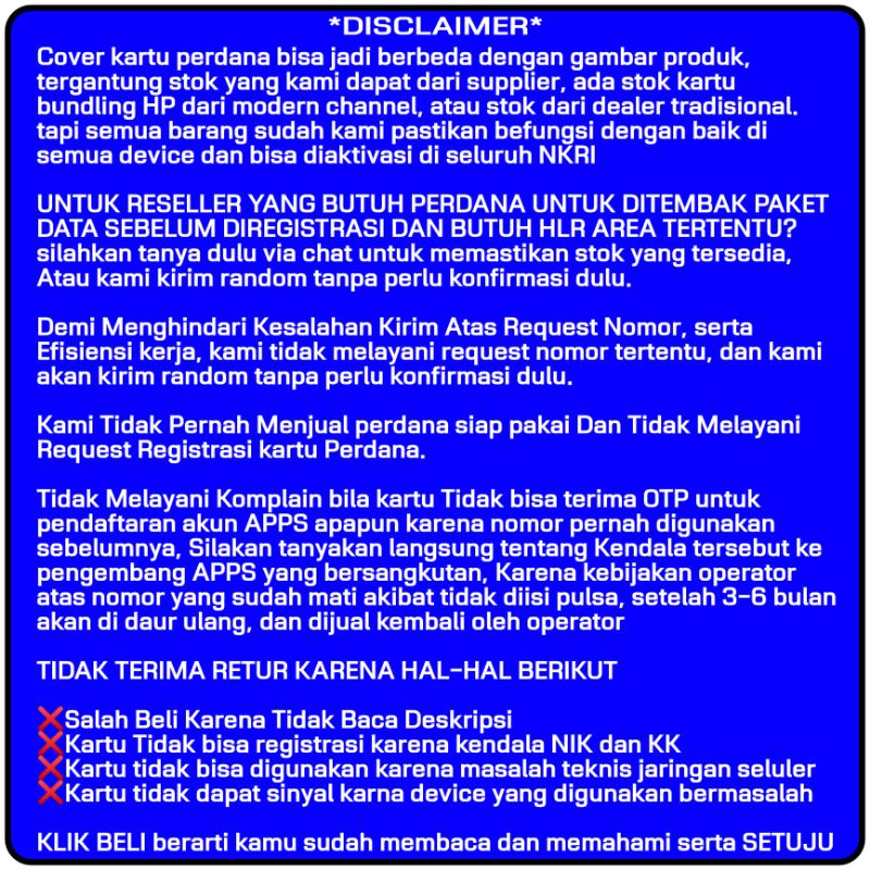 - Jika nomor yang diterima tidak sesuai atau tidak dapat sinyal, Anda dapat mengajukan pengembalian dengan syarat disertai bukti video.